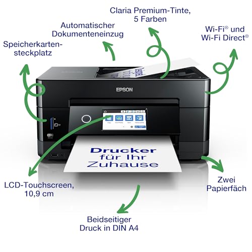 | Features | Elegant und vielseitig – Unansehnliche Technologie gehört der Vergangenheit an: Dieses Multifunktionsgerät macht aus jeder Perspektive eine gute Figur – Es verfügt über einen automatischen Dokumenteneinzug für das Scannen und Kopieren von mehreren einseitigen oder doppelseitigen Dokumenten, zwei Papierfächer für DIN A4-Dokumente und Fotopapier, eine Funktion für doppelseitiges Drucken in DIN A4, um Papier zu sparen, und einen Einzug für Sondermedien auf der Rückseite zum Bedrucken von stärkeren Medien, Die Vorteile beider Welten – Dank der neuen Claria Premium Ink-Tintenserie mit fünf Farben aus Farbstoff- und Pigmenttinten erzielen Sie gestochen scharfe und klare Textdokumente sowie brillante Fotos – Claria Premium umfasst auch eine Photo Black-Tintenpatrone – Das sorgt für kristallklare Fotos mit lebendigen Farben und tiefen, satten Schwarztönen, Mobiles Drucken – Drucken Sie mit den kostenlosen Apps von Epson, Wi-Fi und Wi-Fi Direct von Smart-Geräten aus – Sie können mit der App Epson iPrint* kabellos drucken oder scannen oder die App Epson Creative Print* ausprobieren, um Fotos von Facebook zu drucken und Grußkarten sowie vieles mehr zu erstellen – Oder Sie nutzen Epson Email Print*, um von praktisch überall auf der Welt Druckaufträge zu starten, indem Sie Dateien per E-Mail an den Drucker schicken, Benutzerfreundliche Funktionen – Er verfügt über einen interaktiven Touchscreen von 10,9 cm und einen Speicherkartensteckplatz zum einfachen Navigieren und direkten Ausdrucken von Fotos ohne Computer – Das Bedrucken geeigneter CDs und DVDs ist ebenso möglich – Das Bedienfeld und Papierausgabefach mit Motor sorgen für noch einfachere Bedienung und müheloses Drucken, * siehe epson.de/cartridgefootnotes |