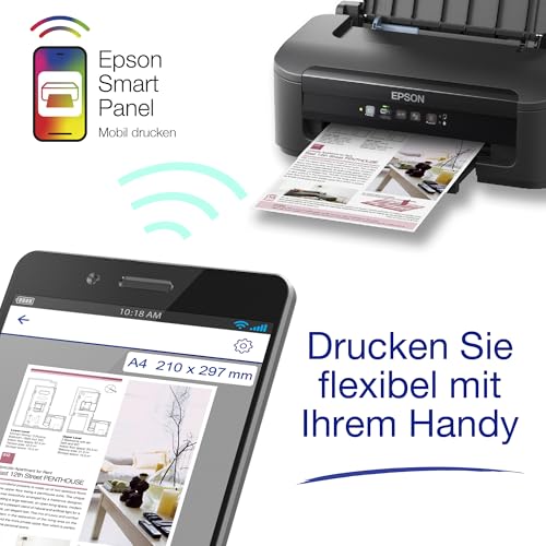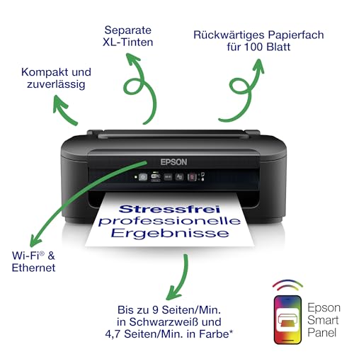 | Features | Kompakt und zuverlässig – Mit diesem platzsparenden DIN-A4-Farbdrucker brauchen Sie nicht viel Platz auf dem Schreibtisch im Homeoffice oder Kleinbüro. Daher ist er optimal für das Drucken von Dokumenten in Büros geeignet., Flexible Anschlussmöglichkeiten – Drucken Sie mit dem WF-2110W so, wie es Ihnen am besten passt. Drucken Sie ganz einfach von Ihrem gewählten Gerät aus, egal ob Desktop, Laptop oder Smart-Gerät, und nutzen Sie Ihr Heim- oder Büronetzwerk, das über Wi-Fi oder Ethernet verbunden ist. Alternativ können Sie sich über USB direkt mit Ihrem Desktop oder Laptop verbinden., Wirtschaftliches Drucken – Der WorkForce WF-2110W benutzt schnell trocknende DURABrite Ultra-Tinte für wisch- und wasserfeste Dokumente in professioneller Qualität, die sofort mit einem Textmarker bearbeitet werden können. Tintenpatronen sind auch in XL-Größe erhältlich, was zu weiteren Kosteneinsparungen beiträgt, da Benutzer*innen bis zu 2,5-mal mehr Seiten drucken können*., Mobiles Drucken – Mit der Smart Panel-App von Epson können Sie den Drucker von Ihrem Gerät aus bedienen, Dokumente drucken, überwachen und Fehler beheben*. |
