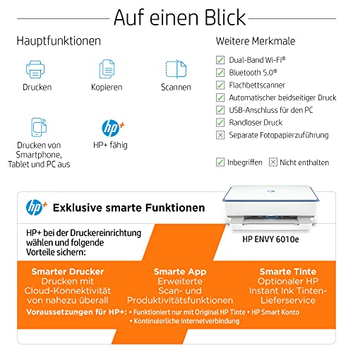 | Features | Druckereigenschaften: Platzsparender Fotodrucker, vielseitiger Multifunktionsdrucker mit Randlosdruck und Fotodruck in Laborqualtität, drucken von Smartphone oder Tablet, Duplex, WLAN, Airprint, Druckgeschwindigkeit: Bis zu 10 Seiten/Min (Schwarzweiß), bis zu 7 Seiten/Min (Farbe); Druckqualität: bis zu 4800 x 1200 dpi; Anschlüsse: WiFi, Hi-Speed USB 2.0, mobiles Drucken, Einfache 3-Schritte Installation mit HP Easy Start, einer automatisierten Download- und Installationsanwendung für HP Drucker: 1. HP Smart App installieren 2. Drucker-WLAN aktivieren 3. Drucker mit HP Smart App koppeln; Geführte Unterstützung mit gratis Support Hotline (DE: 06929993434 / AT: 013602774402), Mit HP+ erhalten Sie 3 Probemonate Instant Ink und weitere Vorteile. In den 3 Probemonaten HP Instant Ink sind bis zu 700 Seiten/Monat inklusive – egal, welcher Tarif. Monatliche Kosten nach Ablauf der Probemonate ab 1,49€/Monat. Monatlich kündbar. Aktivierung von HP+ während der Druckerinstallation erforderlich., Dieser Drucker ist nur für Patronen bzw. Kartuschen vorgesehen, die mit Original HP Chips und Schaltkreisen ausgestattet sind. Produkte mit Chips oder Schaltkreisen von Fremdherstellern werden blockiert. Regelmäßige Firmware-Updates erhalten die Wirksamkeit dieser Maßnahmen aufrecht. |