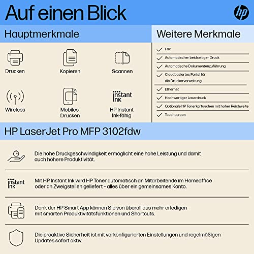HP LaserJet Pro MFP 3102fdw Laserdrucker, Multifunktions-Laserdrucker, Automatischer Duplex, Hohe Druckgeschwindigkeiten, WLAN, Ethernet, USB Hi-Speed, Fax, HP Smart App, HP Wolf Pro Security