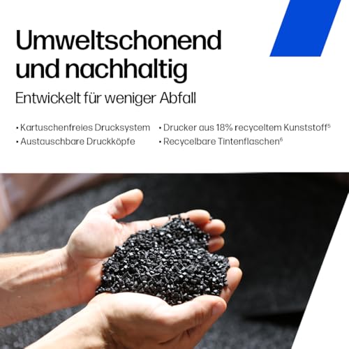 HP hat beim Design dieses Druckers auch an die Umwelt gedacht. Die Tintenflaschen sind recyclingfähig und der Drucker selbst besteht teilweise aus recyceltem Kunststoff. Das Reduzieren von Abfall durch austauschbare Druckköpfe zeigt ein starkes Engagement für Nachhaltigkeit.