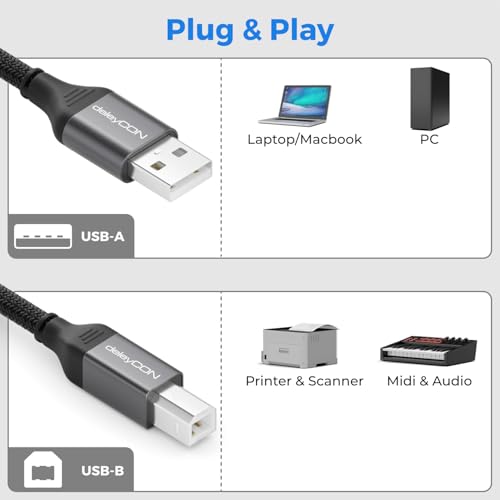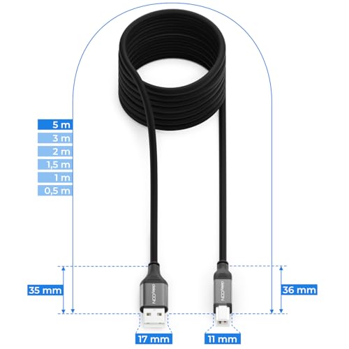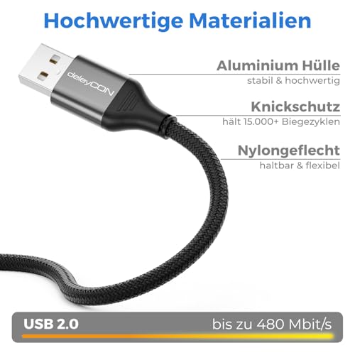 deleyCON 5m USB Druckerkabel (für Drucker, Scanner, MIDI) USB-A auf USB-B Kabel Printer Cable Geflochten + Metallstecker für Epson Brother Canon Notebook Tablet PC MacBook HP Samsung