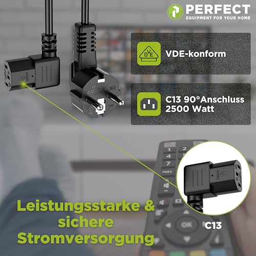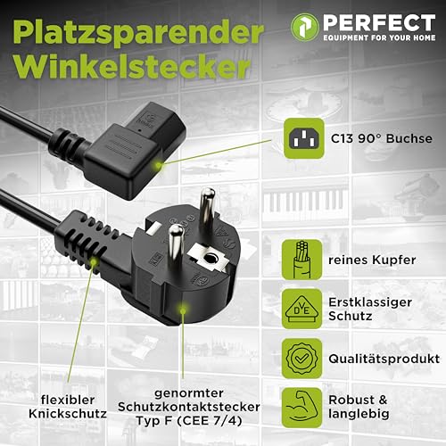 Perfect Stromkabel Kaltgerätekabel 3 Polig, 2,0m, Schuko Stecker Netzstecker Schutzkontakt auf Kaltgerätekupplung C13 Buchse, 90° Winkel Strom Kabel Netzkabel Netzteil für Monitor PC Drucker, Schwarz