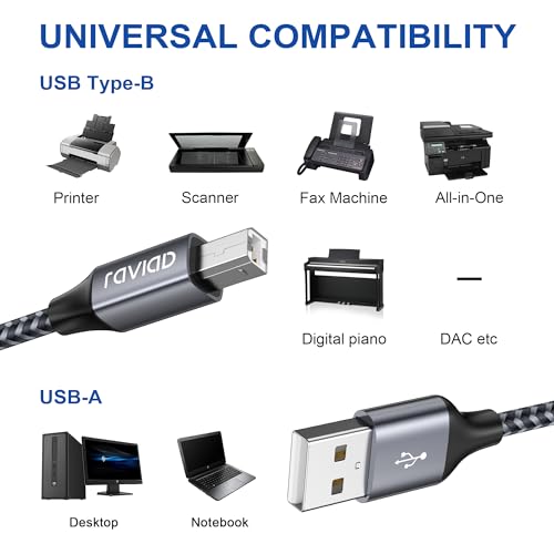 Das RAVIAD Druckerkabel ist mit einer Vielzahl von Geräten kompatibel, darunter Drucker, Scanner und Multifunktionsgeräte namhafter Hersteller. Diese breite Unterstützung macht es zu einer praktischen Wahl für Nutzer, die unterschiedliche Geräte verwenden.