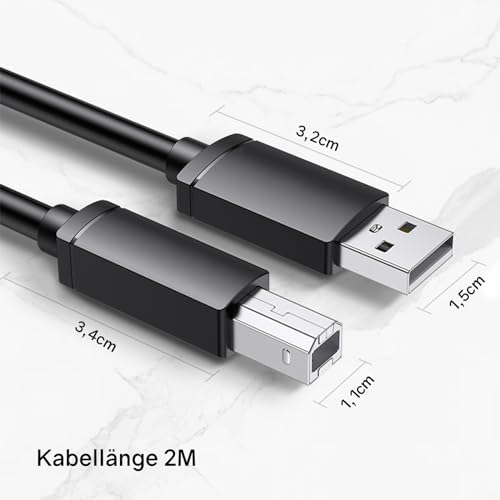 | Features | 【USB-Druckerkabel】Das USB 2.0-Druckerkabel ist perfekt für den Anschluss von Drucker/Scanner/Server/Kamera und anderen USB-B-Stecker-Geräten an Ihren Computer/Laptop. (HINWEIS: Bitte bestätigen Sie vor dem Kauf, dass Sie diesen Typ-B-Stecker benötigen.), 【Hochgeschwindigkeits-Datenübertragung】Dieses USB-Druckerkabel unterstützt eine Hochgeschwindigkeits-Datenübertragung von bis zu 480 Mbit/s und sorgt so für eine schnelle und zuverlässige Druckleistung. Sie können Ihre Dokumente, Fotos und andere Dateien einfach und effizient drucken., 【Hochwertige Materialien】Dieses USB-Druckerkabel besteht aus hochwertigen Materialien wie Kupferdraht, Aluminiumfolie und PVC-Mantel. Es verfügt über eine hohe Haltbarkeit, Korrosionsbeständigkeit und Anti-Interferenz-Fähigkeit. Zudem verfügt es über eine lange Lebensdauer und hält mehrfachem Ein- und Ausstecken stand., 【Kompatibel mit den meisten Druckern und Computern】Dieses USB-Druckerkabel ist mit den meisten Druckern und Computern kompatibel, die über einen USB-A-Anschluss und einen USB-B-Anschluss verfügen. Es funktioniert gut mit Druckern von HP, Canon, Epson, Brother, Samsung, Dell, Lexmark und anderen Marken. Es funktioniert auch mit Windows, Mac, Linux und anderen Betriebssystemen., 【Perfekt zum Anschließen Ihres Druckers an Ihren Computer】Dieses USB-Druckerkabel eignet sich perfekt zum Anschließen Ihres Druckers an Ihren Computer. Sie können damit von Ihrem Laptop, Desktop, Tablet oder Smartphone aus drucken. Sie können damit auch Daten von Ihrem Drucker scannen, kopieren, faxen oder auf Ihren Computer übertragen., 【Einfach zu verwenden】Dieses USB-Druckerkabel ist einfach zu verwenden, schließen Sie es einfach an und schon kann es losgehen. Keine Treiber- oder Softwareinstallation erforderlich. Die Länge ist unterschiedlich, was für die meisten Szenarien ausreichend ist. Es hat auch eine schwarze Farbe, die zu den meisten Geräten passt. |