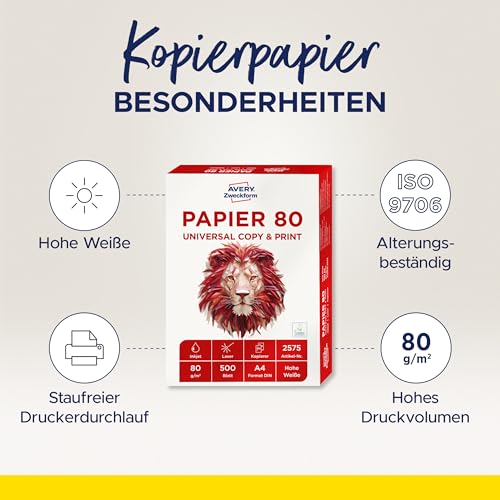 AVERY Zweckform 2575 Druckerpapier, Kopierpapier (1.500 Blatt, 80 g/m², DIN A4 Papier, für alle Drucker) 1 Box mit 3 Pack, weiß