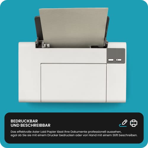 | Features | EINZIGARTIGE OPTIK – Aster Laid ist eine spezielle Papierart, die durch die Herstellungsweise feine Rippen aufweist. Zu vergleichen sind diese mit einer Art Wasserzeichen und werden nur dann besonders deutlich, wenn man das Papier gegen das Licht hält. Dieser Effekt verleiht dem Papier eine ganz eigene Optik., HOCHWERTIG UND ELEGANT – Aster Laid Papier findet Anwendung überall dort, wo die höchste Qualität und originelles Design verlangt werden. Es ist die perfekte Wahl für edle Firmenkorespondenz. Das auserlesene Papier fügt jedem Dokument eine wertige Note hinzu und verschafft einen ganz besonderen Auftritt., BEDRUCKBAR UND BESCHREIBBAR – Mit dem fein gerippten Karton können Sie Urkunden, Diplome, Zertifikate oder Auszeichnungen selbst erstellen. Das effektvolle Aster Laid Papier lässt Ihre Dokumente professionell aussehen, egal ob Sie sie mit einem Drucker bedrucken oder von Hand mit einem Stift beschreiben., ZU JEDEM ANLASS – Das edle Aster Laid Papier mit feiner Rippung ist vielseitig einsetzbar. Es ist ideal für Weihnachtsbriefe, Hochzeitbriefe, Liebesbriefe, Einladungsbriefe, Glückwunschkarten, Konfirmationskarten, Kommunionskarten, Taufkarten, Geburtskarten, Jubiläumskarten, Trauerbriefe oder Danksagungen., TECHNISCHE DATEN – 50 Blätter, Format A4 (210×297 mm), Grammatur 120g, Naturpapier fein gerippt (auf der Vorder- und Rückseite), holzfrei, FSC-zertifiziert, Laser- und Inkjet geeignet. Ein Drucktest wird empfohlen. Die Farbe des angebotenen Produkts kann von der Farbdarstellung Ihres Monitors abweichen. |