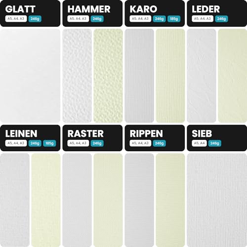 | Features | UNTERSCHIEDLICHE PRÄGUNGEN – Die Struktur-geprägten Elfenbeinkartons in Weiß und Creme bieten eine große Auswahl an verschiedenen Prägungen: Leinen, Leder, Karo, Hammer, Raster oder Rippen. Die Grammatur 246 g/qm ist deutlich steifer als normales Druckpapier und eignet sich für alle Erzeugnisse, wo ein dickeres Papier benötigt wird: Diplome, Verpackungen, Mappen, Speisekarten., FEST UND STEIF – Die Elfenbeinkartons zeichnen sich durch hohe Festigkeit und Steifigkeit aus. Der hohe Zellstoffanteil und die Prägung verdichten die Kartons und machen sie außergewöhnlich fest und steif, was für Visitenkarten oder Menükarten besonders wünschenswert ist. Durch die Festigkeit und die fühlbare Prägung erhalten Druckprodukte eine ganz besondere Haptik., KLASSISCHE ELEGANZ – Die exklusiven Kartons mit den homogenen und gleichmäßigen Oberflächen garantieren die besten Druckergebnisse und gewährleisten hervorragende Ergebnisse bei der Weiterverarbeitung. Die fein geprägten Oberflächenstrukturen fühlen sich gut an, sehen edel aus und vermitteln den Kartons einen natürlichen Charme., VIELFALT VON ANWENDUNGEN – Die Kartons sind optimal geeignet für Glückwunschkarten, Grußkarten, Getränkekarten, Spielkarten, Geschäftsberichte, Broschüren, Displays, Kalender, Bucheinbände, Fotoalben. Sie sind ideal für Einladungskarten zum Geburtstag, Jubiläum, zur Hochzeit, Taufe oder Kommunion., TECHNISCHE DATEN – 20 Blätter A4 (210 × 297 mm), Grammatur 246g, leinen-geprägte Oberfläche, zweiseitig geprägt, holzfrei, FSC-zertifiziert, Laser- und Inkjet geeignet. Ein Drucktest wird empfohlen. Die Farbe des angebotenen Produkts kann von der Farbdarstellung Ihres Monitors abweichen. |