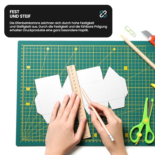 Der Struktur-Karton besticht durch seine hohe Festigkeit und Steifigkeit. Die Prägung sorgt nicht nur für ein ansprechendes Aussehen, sondern auch für eine fühlbare Haptik, die besonders bei Visitenkarten und Menükarten gewünscht ist. Die Oberflächenstruktur ist gleichmäßig und sorgt somit für perfekte Druckergebnisse.
