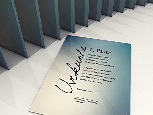 | Features | DESIGN: Sie erhalten von uns ein hochwertiges Urkundenpapier 10 Blatt in Premiumqualität und mit Bestpreis-Garantie. Es hat ein tolles modernes Design und obwohl es sehr stabiles Papier ist, lässt es sich problemlos bedrucken., PAPIER: Es handelt sich um ein einseitig bedrucktes Briefpapier in dem Format DIN A4 – 210 x 297 mm. Das gesamte Sortiment ist für Laserdrucker, Tintendrucken und Kopierer, sowie auch für das Beschreiben von Hand geeignet., VIELSEITIG EINSETZBAR: Sie können das Motivpapier als Urkunden für Sport wie Fußball, Tennis, Leichtathletik, als Zertifikate für Seminare und Weiterbildungen, Zeugnisse, für Vereine wie Schützenvereine oder Tierclubs verwenden., PASSENDE DRUCKVORLAGEN: Zu den Urkunden gibt es auch passende Druckvorlagen, die man sich herunterladen kann. Diese bestehen aus einer Word-Datei, in der man nur den Text ändern muss und dann die Urkunden bedrucken kann., STABIL: Das Papier ist stabil genug, um ohne Rahmen oder ähnliches überreicht zu werden. Durch das A4-Format passen die Urkunden aber natürlich auch perfekt in Rahmen der Größe 30×40 mit Passepartout. |