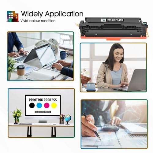 | Features | Cool Toner kompatibel mit Tonerkartuschen: 1 Schwarz CF540X, 1 Cyan CF541X, 1 Gelb CF542X, 1 Magenta CF543X für HP 203X, 203A, CF540A, CF541A, CF542A, CF543A (nicht original)., Seitenleistung: 3200 Seiten für CF540X, 2500 Seiten für CF541X/CF542X/CF543X, Tonerkartuschen, mit 5 % Deckung pro Seite (Briefformat/A4)., Kompatible Drucker: HP Color LaserJet Pro MFP M281fdw, MFP M281fdn, MFP M280nw, MFP M281cdw, HP Color LaserJet Pro M254dw, M254nw, M254dn Drucker., Farbe: 1 x Schwarz, 1 x Cyan, 1 x Gelb, 1 x Magenta, 203X-, 203A-Tonerkartuschen., Einfach zu installieren, perfekt abgestimmter 203X-, 203A-Toner, raffinierter Toner und hochwertiges Zubehör sorgen für stabilen Druck und konstante Druckqualität. |