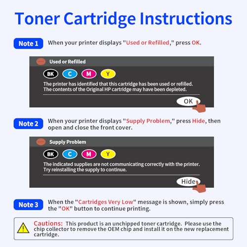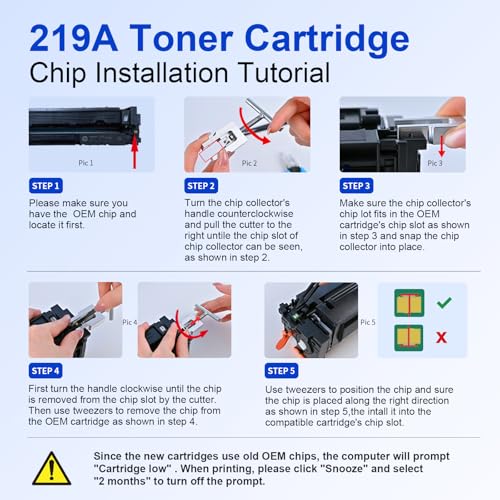 Zusätzlich wird darauf hingewiesen, dass der Chip für den Toner nicht im Produkt enthalten ist. Es wird empfohlen, den Original HP 219A oder 219X Chip zu verwenden, um die volle Funktionalität zu gewährleisten. Diese Klarstellung vermeidet Missverständnisse und mögliche Fehler während der Installation.