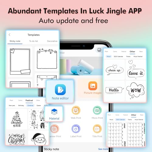 | Features | [Vielseitig und kompakt] Dieser 57mm Mini Drucker ist perfekt für alle Ihre mobilen Druckanforderungen, von Etiketten und Fotos bis hin zu Listen und kleinen Quittungen. Im Lieferumfang sind 6 Rollen Thermopapier und 5 Rollen selbstklebendes Thermopapier enthalten, um alle Ihre Druckanforderungen zu erfüllen. Es ist ein ideales Thanksgiving-, Weihnachts- und Geburtstagsgeschenk für Kinder, Studenten, Freunde und Handwerksliebhaber., [Hochauflösende Druckqualität] Dieser Minidrucker verfügt über einen hochauflösenden 203-dpi-Druckkopf, der gestochen scharfe Bilder, schnelleres und leiseres Drucken sowie eine stabile Leistung liefert. Unterstützt das Drucken von Text, Bildern, QR-Codes, Etiketten usw., damit Sie Ihr Leben besser aufzeichnen können, [Benutzerfreundliche Konnektivität und App-Unterstützung] Verbinden Sie Ihre Android-/iOS-Geräte einfach über die BT-Funktion und genießen Sie nahtloses Drucken mit unserer kostenlosen App – Luck Jingle. Die intuitive Benutzeroberfläche der App macht das Drucken schnell und einfach., [Lange Akkulaufzeit] Ausgestattet mit einem eingebauten wiederaufladbaren Lithium-Akku mit 1500 mAh bietet er eine beeindruckende Arbeitszeit von 8 bis 10 Stunden, sodass Sie den ganzen Tag über produktiv bleiben, ohne ständig aufladen zu müssen. Klein und leicht, lässt es sich leicht transportieren und jederzeit und überall aufzeichnen, was Sie aufnehmen möchten., [Lange Akkulaufzeit] Ausgestattet mit einem eingebauten wiederaufladbaren Lithium-Akku mit 1500 mAh bietet er eine beeindruckende Arbeitszeit von 8 bis 10 Stunden, sodass Sie den ganzen Tag über produktiv bleiben, ohne ständig aufladen zu müssen. Klein und leicht, lässt es sich leicht transportieren und jederzeit und überall aufzeichnen, was Sie aufnehmen möchten. |