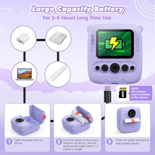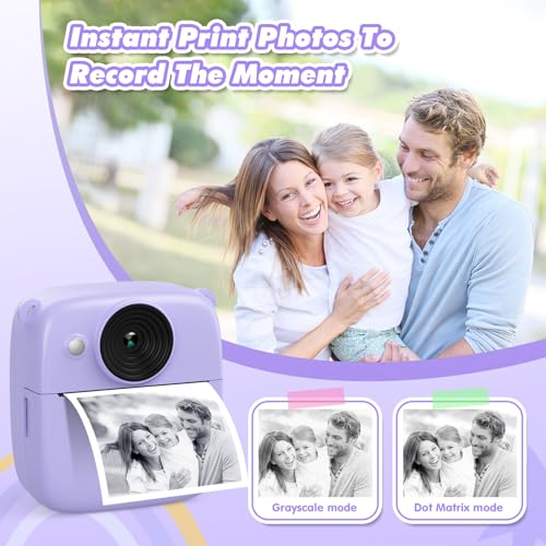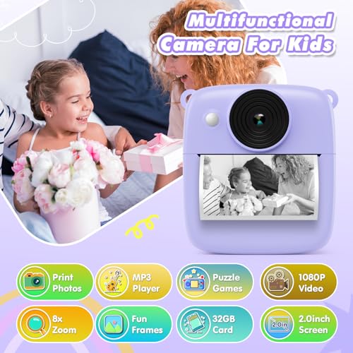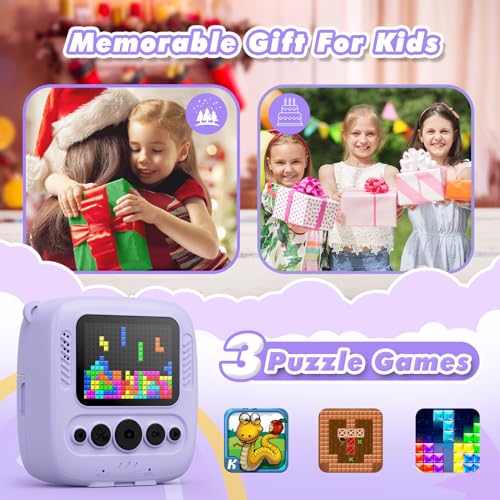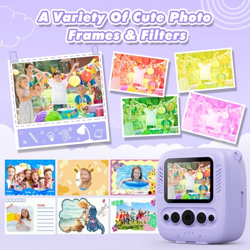 CalineGam Kinderkamera Sofortbildkamera, 48MP Sofortbildkamera Kinder mit 32GB Karte & Druckpapier, 1080P Digitalkamera Kinder, Geschenke für Jungen und Mädchen 3-12 Jahre (Lila)