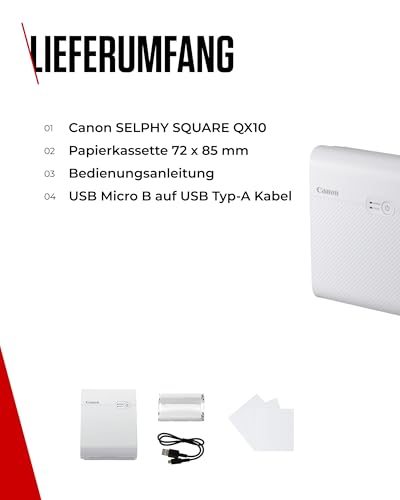 | Features | HOCHWERTIGER UND LANGLEBIGER FOTODRUCK – Der Selphy Square QX10 druckt bis 6,8 x 6,8 cm große Fotos auf hochwertigem Papier im Format 7,2 x 8,5 cm mit beschreibbarem variablen Rand – für den ganz besonderen Look. Sie bleiben bis zu 100 Jahre farbstabil und verfügen über eine Schutzfolie gegen Schmutz und Wasser sowie eine Kleberückseite, IMMER BEREIT – Dank eingebautem Akku, WLAN und einer integrierten Papierkassette mit Platz für bis zu 10 Blatt (72 x 85 mm) ist der mobile Foto Drucker immer dort im Einsatz, wo die Foto-Action stattfindet, SIMPEL UND SCHNELL – Mit der kostenlosen Selphy Photo Layout App von Canon können Lieblingsmotive in ca. 43 Sekunden in quadratische Prints im Sofortbild-Look gedruckt werden. Auch mit Fotoprints lassen sich ganz einfach kreative Akzente hinzufügen – wie z. B. Stempel, Filter, Rahmen, Text, Überlagerungen und Layouts, KOMPAKT UND LEICHT (14,3 x 10,2 x 3,1 cm, 480g) – Kleiner als eine Postkarte und mit weniger als 500 g passt der portable Fotodrucker in fast jede (Hand-)Tasche oder Rucksack. Zusammen mit dem separat erhältlichen Fotopapier Canon XS-20L erstellt er quadratische Prints im Sofortbild-Look mit Kleberückseite, LIEFERUMFANG – Canon Selphy Square QX10 in weiß, USB Micro B auf USB Typ-A Kabel, Kurzanleitungen, Starterset für 3 Foto-Ausdrucke |