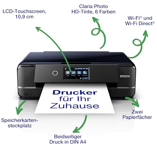 | Features | Eignet sich für den Druck brillanter und langlebiger Fotos bis zum Format DIN A3 dank 6-Farb-Tintensystem (black, cyan, light cyan, magenta, light magenta, yellow), Schnittstellen: Ethernet, WiFi und WiFi Direct – kabelloses Drucken von überall, mobile Druckfunktionen, USB, Fotos PC-unabhängig drucken dank 10,9 cm Touchscreen und USB- bzw. SD-Speicherkartenleser, Randlos drucken bis DIN A3, Scannen und Kopieren bis DIN A4, Duplexfunktion für beidseitiges Drucken, zwei Papierfächer an der Vorderseite (für DIN A4- und Foto-Papier), 10 x 15 cm Fotodruck in 11 Sek., Direktdruck auf CD/DVD, 6 einzeln austauschbare Tintenpatronen – wahlweise in Standard oder XL, Nie wieder ohne Tinte: Mit ReadyInk und Amazon Dash Replenishment können Sie rechtzeitig und Abo-frei Tinte für Ihren Drucker erwerben, Lieferumfang: Hauptgerät, separate Einzelpatronen, Stromkabel, Aufstellanleitung, Software (CD), Garantiedokument |