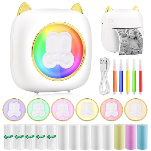 GuKKK Mini Drucker, Mobiler Fotodrucker, Tragbarer Mini Fotodrucker, Wireless Fotodrucker Thermodrucker, mit 13 Rollen Druckerpapie und 5 Buntstifte, Smartphone Bluetooth Drucker, für Liste, Journal