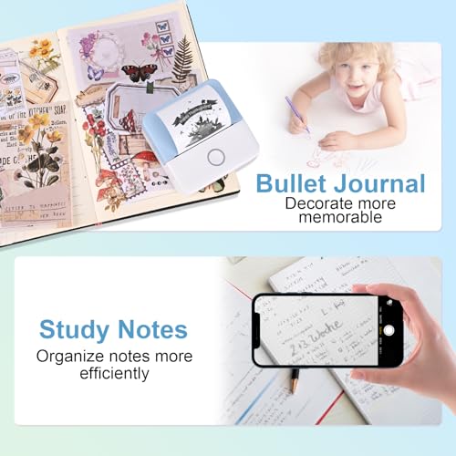 GuKKK Mini Drucker, Mobiler Fotodrucker, Tragbarer Mini Fotodrucker, Wireless Fotodrucker Thermodrucker mit 13 Rollen Druckerpapie und 6 Buntstifte, Smartphone Bluetooth, für Liste, Journal