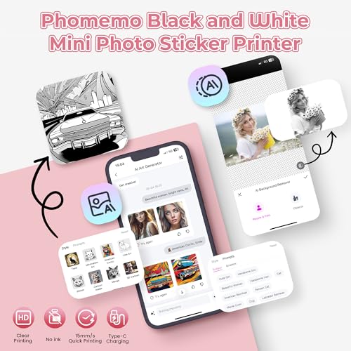Phomemo Mini Etikettendrucker,T02 Sticker Fotodrucker für Smartphone,Handy Thermodrucker klein mit 3 Rollen Thermal Papier,203dpi Aufkleber Bluetooth Druckbuddy Drucker Schwarz und Weiß Miniprint