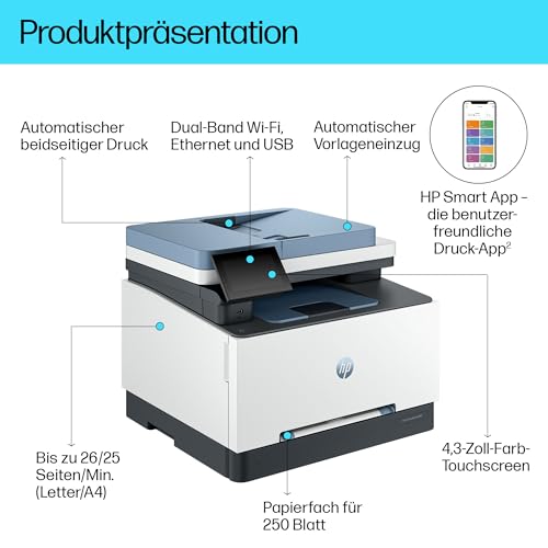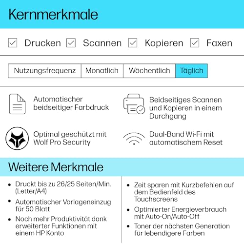| Features | 40€ Cashback sichern: Beantragen Sie online Ihren Cashback innerhalb von 30 Kalendertagen nach Kauf unter dem folgenden Link (Deutschland & Österreich): hp.com/go/hpcashback., Hohe Geschwindigkeit: Automatischer beidseitiger Hochgeschwindigkeitsfarbdruck mit 25 Seiten pro Minute, automatische Wiederherstellung bei Papierstau, automatischer Vorlageneinzug für bis zu 50 Blatt, Leuchtende Farben: TerraJet Toner der nächsten Generation, der für lebensechtere, lebendigere Farben entwickelt wurde, Professionelle Sicherheit & Leistung: HP Wolf Pro Security, integrierte Sicherheitsfunktionen und manipulationssichere Toner schützen Ihr Unternehmen, Preisgekrönte Zuverlässigkeit & energieeffizientes Design: Drucken mit geringem Wartungsaufwand, Wi-Fi, das sich automatisch wieder verbindet, energiesparende Auto-On/Auto-Off-Technologie, HP TerraJet Toner mit geringem Stromverbrauch, Duplex als Standard, Druckgeschwindigkeit bis zu 26/25 S./Min. (Letter/A4)); 250-Blatt-Papierfach mit Mehrzweck-Einzelblatteinzug; Anschlüsse: Dual-Band Wi-Fi, Wi-Fi Direct, High-Speed USB, Ethernet, Dieser Drucker ist nur für Patronen bzw. Kartuschen vorgesehen, die mit Original HP Chips und Schaltkreisen ausgestattet sind. Produkte mit Chips oder Schaltkreisen von Fremdherstellern werden blockiert. Regelmäßige Firmware-Updates erhalten die Wirksamkeit dieser Maßnahmen aufrecht. |
