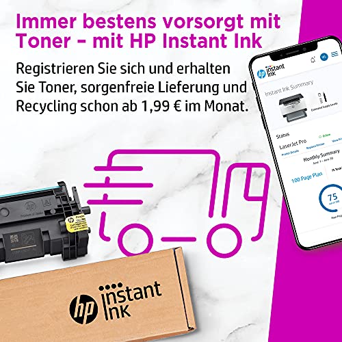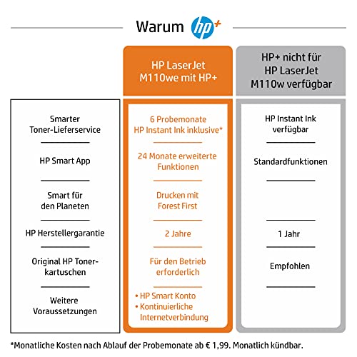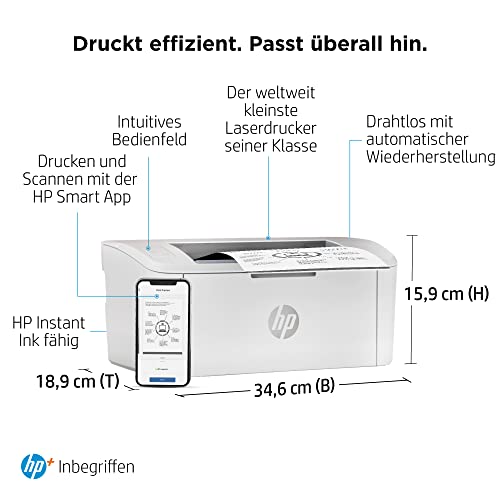 | Features | Mit HP+ erhalten Sie 6 Probemonate Instant Ink und weitere Vorteile; In den 6 Probemonaten HP Instant Ink sind bis zu 1500 Seiten/Monat inklusive – egal, welcher Tarif; Monatliche Kosten nach Ablauf der Probemonate ab 1,99 Euro/Monat; Monatlich kündbar; Aktivierung von HP+ während der Druckerinstallation erforderlich, Der weltweit kleinste Laserdrucker seiner Klasse – Druckerabmessungen (B x T x H) Maximal: 346 x 360 x 280 mm, Druckgeschwindigkeit bis zu 20 Seiten pro Minute, Druckauflösung bis zu 600 x 600 dpi, 150-Blatt-Papierzuführung, Mit HP Instant Ink dauerhaft sparen: Nach Ablauf der Probemonate sparen Sie bis zu 50 Prozent bei Toner; Flexible Tarife für jeden – egal ob Sie viel oder wenig drucken; Recycling inklusive, Dieser Drucker ist nur für Patronen bzw. Kartuschen vorgesehen, die mit Original HP Chips und Schaltkreisen ausgestattet sind; Produkte mit Chips oder Schaltkreisen von Fremdherstellern werden blockiert; Regelmäßige Firmware-Updates erhalten die Wirksamkeit dieser Maßnahmen aufrecht |