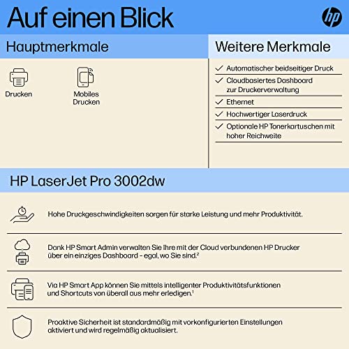 Der HP LaserJet Pro 3002dw ist der ideale Laserdrucker für effizientes Arbeiten bis zu 7 Personen. Mit automatischem beidseitigen Druck und einer Geschwindigkeit von bis zu 33 Seiten pro Minute sparst du Zeit und Kosten.
