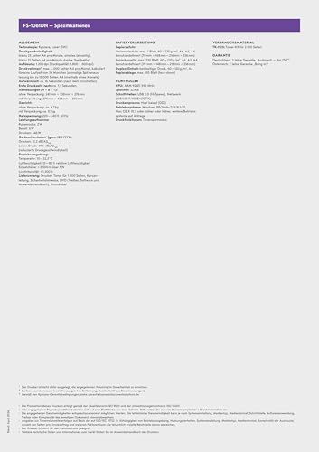 | Features | Hochwertig: Der Ecosys FS-1061DN Laserdrucker dient dem schnellen Drucken von Dokumenten in schwarz-weiß und überzeugt dank 1200 dpi Auflösung mit höchster Druckqualität, Umweltfreundlich: Klimaschutz-System = klimafreundlich drucken – Weitere Infos zur Kyocera Klimaschutz Initiative finden Sie unter dem Suchbegriff printgreen bei Kyocera in Ihrem Browser, Effizient: Der Drucker mit Duplex-Einheit, Netzwerkschnittstelle und USB 2.0 druckt bis zu 25 Seiten DIN-A4 pro Minute; Die Funktion leiser Druck ermöglicht geräuscharmes Drucken, Herstellergarantie: 3 Jahre; Die Garantiebedingungen finden Sie unter „Weitere technische Informationen“; Ihre gesetzlichen Gewährleistungsrechte bleiben unberührt, Langlebig: Durch die ultraharte Beschichtung der Bildtrommel besitzt der Drucker eine außergewöhnlich hohe Lebensdauer von bis zu 100.000 Seiten und setzt damit neue Maßstäbe |