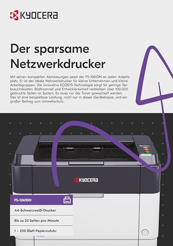 Mit einer Druckgeschwindigkeit von bis zu 25 Seiten pro Minute ist der Kyocera Ecosys FS-1061DN für schnelles Arbeiten konzipiert. Diese Geschwindigkeit eignet sich besonders gut für Büroumgebungen, in denen häufig druckintensive Aufgaben anfallen.