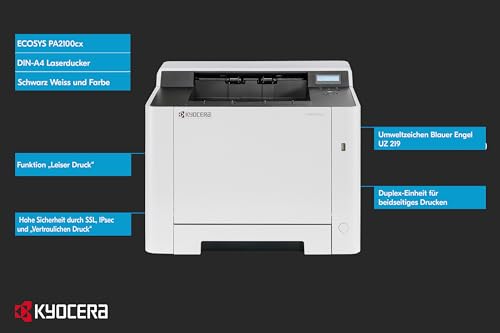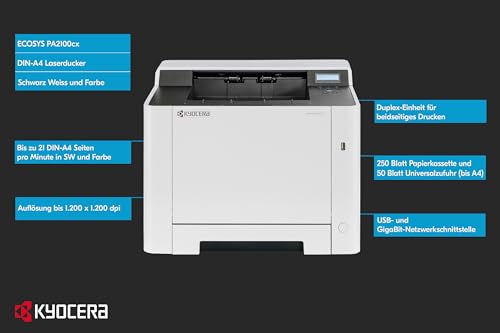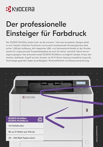 Der Kyocera Ecosys PA2100cx Farblaserdrucker ist eine exzellente Wahl für Benutzer, die Wert auf hohe Qualität und Geschwindigkeit legen. Mit seinen vielseitigen Anschlussmöglichkeiten und der einfachen Nutzung ist er sowohl für den persönlichen als auch für den beruflichen Einsatz geeignet. Die garantierte Langlebigkeit und effiziente Leistung machen ihn zu einer lohnenden Investition für jedes Büro.