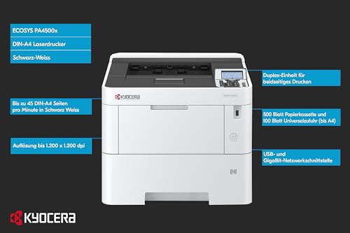 Kyocera Ecosys PA4500x Laserdrucker Schwarz Weiss, Duplex-Einheit, 45 Seiten pro Minute, Laserdrucker mit 100+500 Blatt Zufuhr, Gigabit LAN. Schwarz-Weiss-Drucker mit Mobile Print