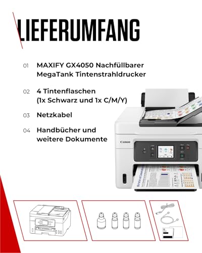 Der Canon MAXIFY GX4050 ist ein leistungsstarker 4-in-1-Multifunktionsdrucker. Er druckt schnell, spart Tinte und bietet hohe Reichweiten. Ideal für Bürobedarf, überzeugt er durch einfache Bedienung und kosteneffizientes Drucken.