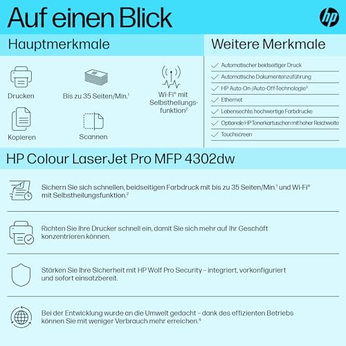 Der HP Color LaserJet Pro MFP 4302dw ist ein leistungsstarker und zuverlässiger Multifunktionsdrucker, der sich ideal für Geschäfts- und Büroumgebungen eignet. Seine exzellente Druckqualität und Geschwindigkeit, kombiniert mit zufriedenstellenden Sicherheitsfunktionen, machen ihn zu einer empfehlenswerten Wahl für alle, die Wert auf professionelle Ergebnisse legen.