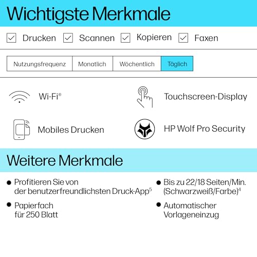 | Features | Besonderheiten: vielseitiger Multifunktionsdrucker mit WiFi, Netzwerk, und Airprint. Automatischer Duplexdruck, Smart-Tasks Befehle und ein großes Farb-Touchdisplay für die Eingabe direkt am Drucker., Druckgeschwindigkeit: bis zu 22 S./Min (Schwarzweiß), bis zu 18 S./Min (Farbe); Druckqualität: bis zu 4800 x 1200 dpi; Anschlüsse: Hi-Speed USB 2.0, Wireless, Ethernet, mobile Druckfunktionen, Einfache 3-Schritte Installation mit HP Easy Start, einer automatisierten Download- und Installationsanwendung für HP Drucker: 1. HP Smart App installieren 2. Drucker-WLAN aktivieren 3. Drucker mit HP Smart App koppeln; Geführte Unterstützung mit gratis Support Hotline (DE: 06929993434 / AT: 013602774402), Mit HP+ erhalten Sie 3 Probemonate Instant Ink und weitere Vorteile. In den 3 Probemonaten HP Instant Ink sind bis zu 700 Seiten/Monat inklusive – egal, welcher Tarif. Monatliche Kosten nach Ablauf der Probemonate ab 1,49€/Monat. Monatlich kündbar. Aktivierung von HP+ während der Druckerinstallation erforderlich., Einige Drucker von HP sind nur für die Verwendung mit Druckpatronen vorgesehen, die über neue oder wiederverwendete Chips oder elektronische Schaltkreise von HP verfügen. Diese Drucker verwenden dynamische Sicherheitsmaßnahmen, um Druckpatronen mit einem nicht von HP stammenden Chip oder einem nicht von HP stammenden elektronischen Schaltkreis zu blockieren. Regelmäßige Firmware-Updates erhalten die Wirksamkeit dieser Maßnahmen aufrecht und blockieren Druckpatronen, die zuvor funktioniert haben. Wiederverwendete HP Chips und elektronische Schaltkreise von HP ermöglichen die Verwendung von wiederverwendeten, wiederaufbereiteten und wiederbefüllten Druckpatronen. |