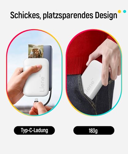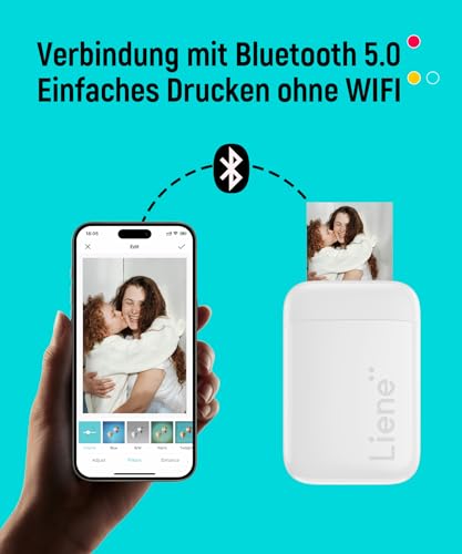 | Features | [Einfaches Drucken über Bluetooth 5.0] Unser Fotodrucker ermöglicht schnelles Drucken durch Verbindung mit Bluetooth 5.0. Ein stabileres Signal und eine größere Reichweite befreien Sie von der Sorge, ohne Wi-Fi zu drucken, wenn Sie im Freien oder auf einer Reise unterwegs sind. Plus, der Liene Mini-Drucker ist mit iOS- und Android-Geräten kompatibel. Schieben Sie die Abdeckung auf, um Fotopapier einzulegen. Verbinden Sie den Mini Drucker und drucken Sie unvergessliche Momente mit einem Klick!, [Tragbares Design, kabelloses Drucken] Liene hat es sich zur Aufgabe gemacht, mehr Glück und Freude durch Fotos zu teilen und hat deshalb diesen Mini Drucker auf den Markt gebracht. Das leichte Gewicht ermöglicht es Ihnen, den Fotodrucker für Smartphones in Ihrer Tasche zur Party zu tragen, was nicht zu viel Platz einnimmt. Der Fotodrucker für Smartphone mit Typ-C-Ladeanschluss., [Tintenloses Zinkdruck] Der Liene Fotodrucker verwendet die fortschrittliche Zink-Tintenlosdrucktechnologie, die die Beschädigung der Druckkopfteile erheblich reduziert und die Lebensdauer des Fotodruckers verlängert. Der Mini Drucker erhitzt das Fotopapier und Bilder sofort. Telefondrucker druckt klare Fotos, auf denen jedes Detail zu sehen ist! Es ist für Liebhaber des Fotodrucks., [2 x 3 Papier mit selbstklebender Rückseite] Der Fotodrucker wird mit 5 zinkfarbenem Papier geliefert. Perfekt für den Druck farbiger Hochzeitsfotos und cooler Kunstfotos. Ziehen Sie die selbstklebende Rückseite ab und kleben Sie es überall auf, in Ihrem Reisetagebuch, Reisegepäck oder neben dem Bücherregal. Das Papier klebt fest und fällt nicht ab. Die Oberfläche des Fotopapiers ist wasser- und staubabweisend. Die gedruckten Fotos werden auch nach 10 Jahren nicht verblassen!, [Dekorieren Sie Ihre Fotos mit der Liene App] Der Liene Fotodrucker wird mit einer multifunktionalen App geliefert, um Ihnen zu helfen, Ihre Bilder zu verändern und zu bearbeiten. Laden Sie die Liene Photo App zum Drucken herunter. Mit den 8 Filtern können Sie die Atmosphäre Ihrer Fotos verändern, Und mit 4 verschiedenen funktionen das Layout Ihrer Fotos individuell gestalten. Egal, ob es ein Geburtstagsgeschenk oder ein Abschlussgeschenk für Ihre Freunde ist,der Mini Drucker ist eine gute Wahl. |
