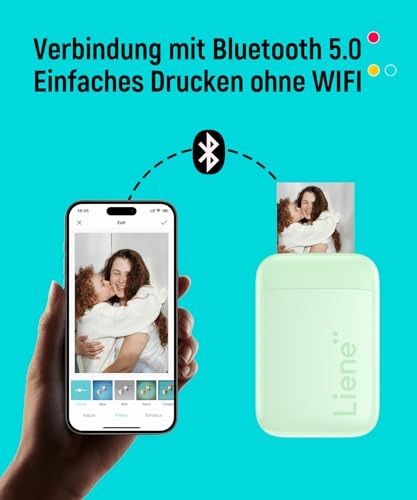 Features | [Zink-Drucktechnologie] Das Drucken wurde durch Tintenpatronen und Papier zu einer teuren Angelegenheit. Doch die Zink-Technologie-Neuerung überflüssigt kostspielige Farbbänder und Toner! Ein Liene Fotodrucker mit Zink Fotopapier ist alles, was Sie für hochqualitative Fotos zu einem günstigeren Preis benötigen. Selbstklebendes Papier im Format 2 x 3 Zoll mit integrierten Farbkristallen sorgt für detailreichen Druck und verwandelt Ihre Fotos in langlebige Erinnerungen., [Überall hin mitnehmen und drucken] Möchten Sie jederzeit und überall Fotos ausdrucken, egal ob bei besonderen Anlässen oder im alltäglichen Leben? Der Liene Mini Fotodrucker passt ideal dazu, denn er ist kaum größer als eine Powerbank mit 12,5 x 8,5 x 2,5 cm Größe und wiegt lediglich 183 g – ein wahrhaftes Leichtgewicht. Es ist kein zusätzlicher Kabelsalat nötig; der Drucker lädt über Typ-C und ist nach einer Ladung bereit für bis zu 30 Ausdrucke., [Bluetooth 5.0-Verbindung] Dank des aktualisierten Bluetooth 5.0 erweitert sich die kompatible Reichweite und die Verbindungsstabilität zwischen dem Fotodrucker und Ihrem Android- oder iOS-Smartphone verbessert sich erheblich. Verwandeln Sie geteilte Momentaufnahmen in physische 2 x 3 Zoll(50x76mm) Bilder, die Sie festhalten und genießen können. Zudem ermöglicht eine innovative Schiebeabdeckung schnellen und einfachen Papierwechsel mit nur einer Hand., [2 x 3" Selbstklebendes Papier] Mit diesem Fotodrucker erhalten Sie 50 Blatt Zink selbstklebendes Fotopapier, welches Sie überall anbringen können: in Fotoalben, auf Notizbücher oder elektronische Geräte, in Schließfächern und an Kühlschränken. Halten Sie mit unserem Smartphone-Fotodrucker alle Ihre schönen Momente wie Feiern, Reisen und vieles mehr fest. Die exzellente Klebekraft und außergewöhnliche Farbqualität bewahren Ihre wertvollen Erlebnisse für die Ewigkeit., [Personalisierte Bilder mit Liene App] Die Liene Photo APP bietet vielfältige Gestaltungsmöglichkeiten wie Bildverbesserung, Filter, Rahmen und mehr. Mit dem Verbesserungsmodus können Bilder getönt, mit Filtermodi Atmosphären geändert, und es stehen vier verschiedene Fotorahmen zur Auswahl, um Ihre Fotos einzigartig zu gestalten. Hinweis: Fotos können ausschließlich über die Liene App gedruckt werden. |