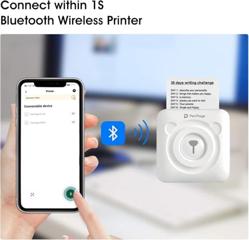 | Features | Verewigen Sie Ihre besten Momente, Mini Drucker für ein Geschenk-Der Etikettendrucker ist klein und leicht, mit einem Design in der Größe einer Handfläche, können Sie ihn leicht transportieren. Der Fotodrucker ist das beste Geschenk für Studenten, Büroangestellte, Liebhaber, Freunde, Familie usw. Die besten Momente können direkt vom Telefon gedruckt werden., Anytime Anywhere-Mini Fotodrucker-Der Mini Drucker kann Fotos, Etiketten, Aufkleber, Nachrichten, Listen drucken. Es kann verwendet werden, um Notizen und Flaschennoten zu Hause zu drucken. Der Kleiner Drucker kann zum Drucken von Notizen während der Arbeit verwendet werden. Und es kann für Memos, Fotos verwendet werden. Auf Reisen ist der kompakte und leichte Smartphone Drucker bequem in Ihrer Tasche zu verstauen., Energiesparendes Genie, ohne Tinte 1000 mAh Etikettendrucker ohne Tinte-Mit einem integrierten wiederaufladbaren 1000 mAh Lithium-Ionen-Akku kann der Minidrucker die hohen Kosten für mehrere Einwegbatterien vermeiden. Zudem benötigt der mobile Drucker keine Tintenpatrone, sodass die Betriebskosten niedrig sind. Geräuscharmes Arbeiten, wird niemand stören, ein idealer Drucker., Klare Auflösung, Mini-Printer von ausgezeichneter Qualität- Mit einer Auflösung von 203 dpi, hat der tragbare Fotodrucker eine klare Druckqualität. Mit einem hochwertigen Druckkopf kann das Druckerpapier Thermopapier mit einer Breite von 56-58 mm und einem Rollendurchmesser von 30 mm drucken. Die Geschwindigkeit des Instantdruckers ist auch sehr schnell., Verbinden Sie sich in 1S,Tragbarer Telefondrucker- Der mini drucker für smartphone kann einfach und schnell mit jedem Smartphone über Bluetooth in 1 Sekunde verbunden werden, und er ist auch geeignet für die Verbindung mit einem PC über USB-Kabel. Bitte folgen Sie der Bedienungsanleitung des Bluetooth-Druckers zum Herunterladen der App / des entsprechenden Treibers auf Ihr Telefon. Verbinden Sie das Bluetooth-Symbol mit der PeriPage-App |