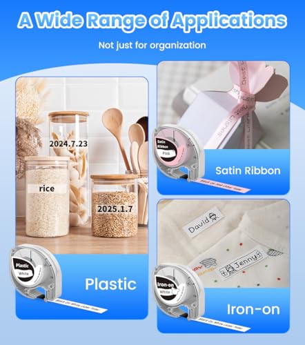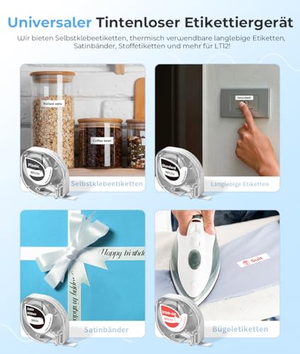 Das Phomemo LT12 unterstützt eine Vielzahl von Etikettenformaten, darunter selbstklebende Etiketten, Satinbänder und Stoffetiketten, die sich hervorragend für kreative Projekte eignen. Ob du deine Küche organisieren, Geschenke dekorieren oder Kleidung kennzeichnen möchtest, der LT12 bewältigt all diese Aufgaben mit Leichtigkeit.