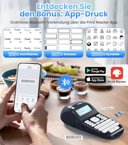 Über die Print Master App, die mit dem Gerät kompatibel ist, stehen dir mehr als 1600 Symbole und zahlreiche Schriftarten zur Verfügung. Dies eröffnet unbegrenzte kreative Möglichkeiten und macht das Gestalten von Etiketten zu einem echten Vergnügen.