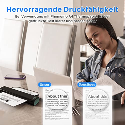 - Lange Akkulaufzeit mit einem 1200 mAh Akku, der bis zu 120 Blatt A4-Thermopapier drucken kann