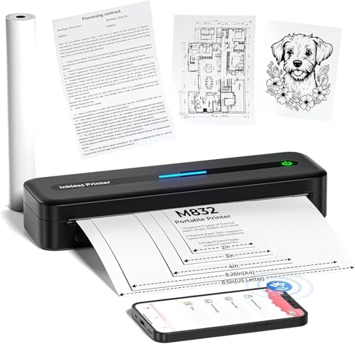 PokeLabel Mobiler Drucker A4 für Unterwegs, Tragbarer Drucker Thermodrucker A4 Wireless Bluetooth Inkless Handy Printer, M832 300dpi Portable Kompakt Reisedrucker für Android/iOS/Win/Mac Laptop