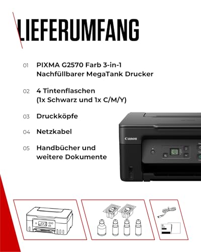 Canon PIXMA G2570 MegaTank 3in1 Multifunktionsgerät Große nachfüllbare Tintenbehälter DIN A4 (Scanner, Kopierer, Drucker, Farbtintenstrahldrucker, USB, LC Display), schwarz/grau